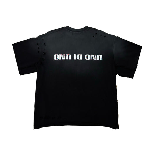 Made with 100% cotton 250 GSM. This garment has a well finished vintage acid wash throughout, with detailed distressing around the body and sleeves. The key feature of this piece is the very unique double collar effect which incorporates two t-shirts specifically sewn together to create this look. The multi-colored gemstones are sewn into the fabric of the t-shirt for the best protection & durability. The text print features “RYAN D’ANGELO” printed upside down across the front & “Uno Di Uno” (One of One in Italian) printed upside down across the back. This Garment embodies the meaning of an exclusive